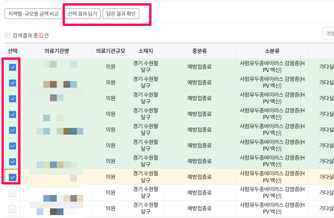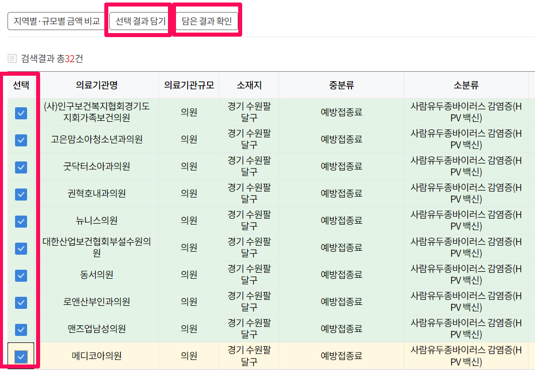 ① 검색 결과 목록에서 10개 병원의 좌측 선택박스를 체크합니다.