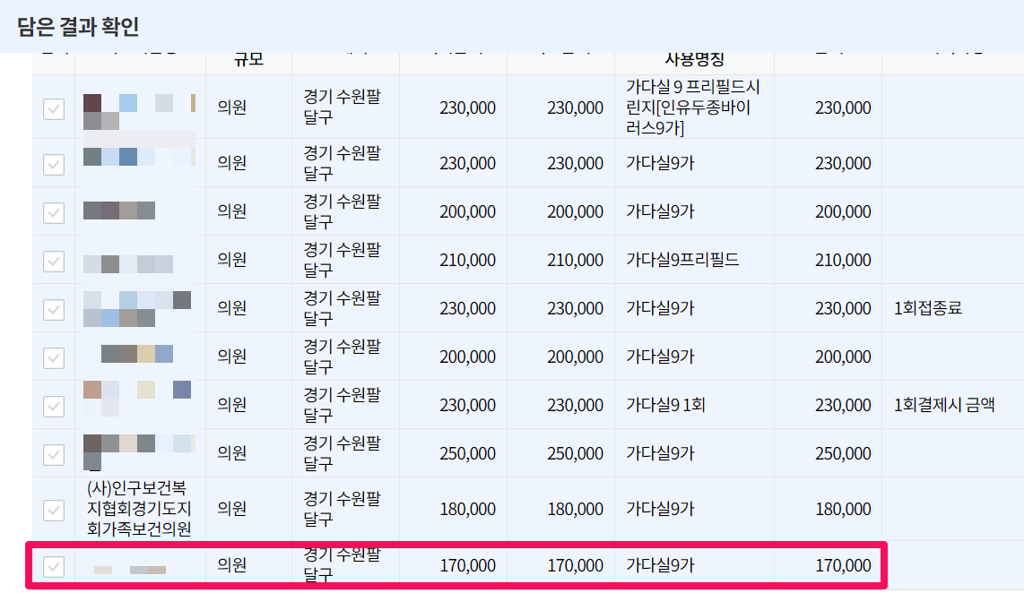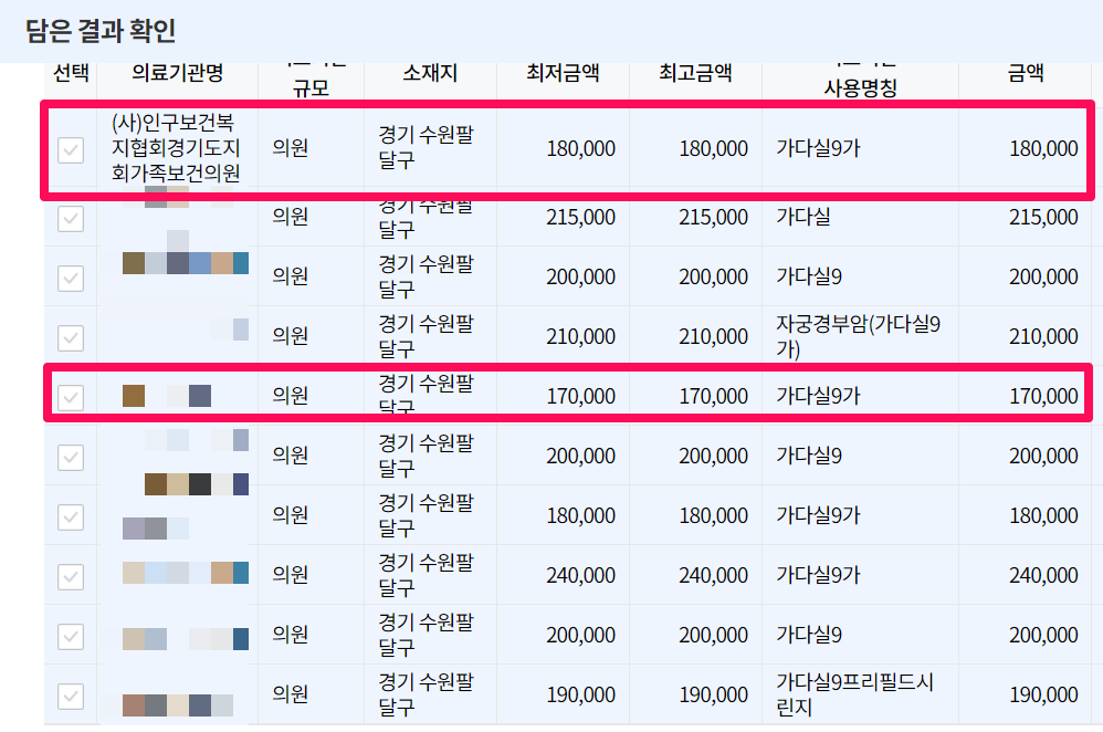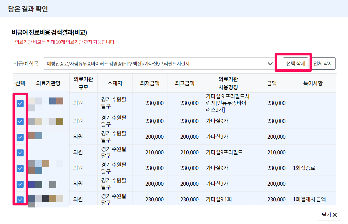 가족보건의원과 17만원이었던 병원은 남기고 나머지 8개 병원은 ‘선택 삭제’ 했습니다.